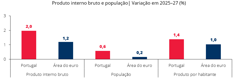 Portugal’s economic performance is expected to continue outpacing the Euro Area average over the next three years. The Bank of Portugal forecasts that GDP growth will exceed the Euro Area average by 0.8 percentage points annually between 2025 and 2027, broadly in line with the 0.7 percentage-point differential recorded between 2020 and 2024.