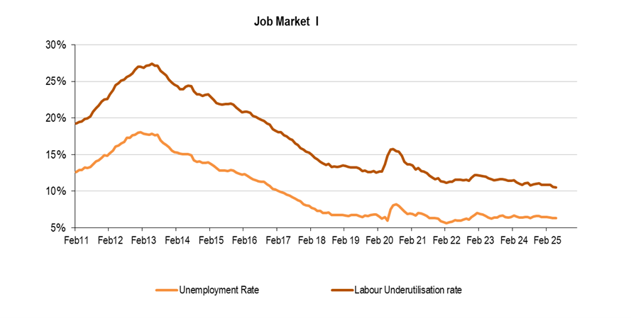 Unemployment Rate (monthly data): the job market stabilized in May at record levels. Active population (5 554 900) and Employed population (5 206 000) keep growing in tandem, close to 2.5%YoY; so, stabilizing the unemployed people close to 350 000; the unemployment rate at 6.3% and Underutilization rate (takes in consideration the under-utilization population divided by a broad concept of Active population) at 10.5% (please see graphs below).