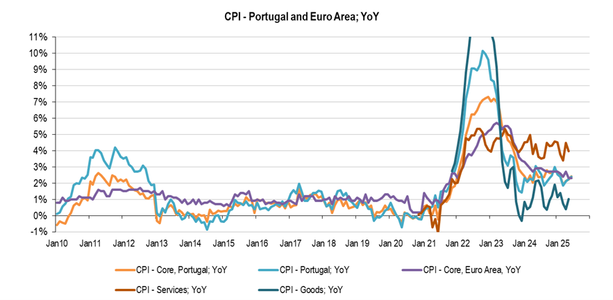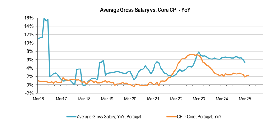 Inflation in Portugal is running between 2% and 2.5%; aligned with the Euro Area inflation, namely core data (excludes volatile items like fresh food and energy, to reveal the underlying trend). Meanwhile, Services inflation, around 4%YoY continues to push upwards the general trend, while Goods inflation around 1%, partially offset it. The strong job market and salaries growing above inflation continues to pressure Services inflation.