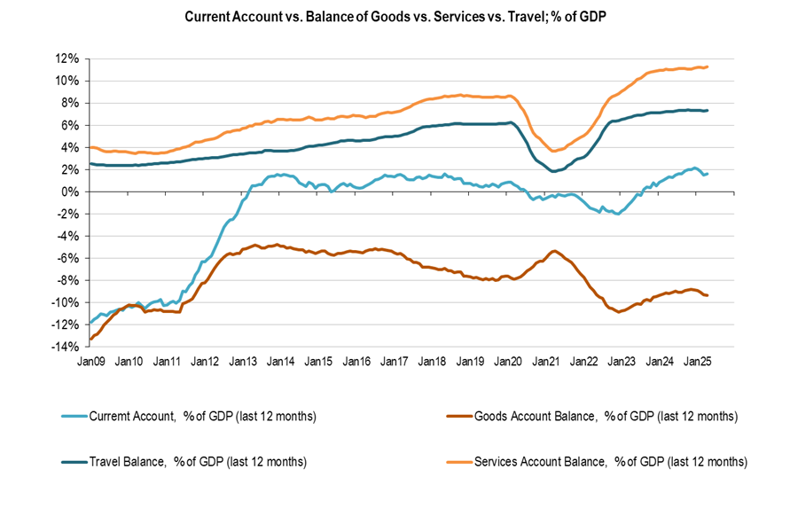 In a nutshell, external figures remain positive mainly due to Services Balance, that runs a Surplus slightly above 11% of GDP (Travel, included on Services Balance, surplus 7.3% of GDP), while the Goods balance runs a structural deficit, that is stabilizing slightly above 9% of GDP. Finally, Primary Income (mainly dividends and interests paid to non-residents) runs a deficit slightly below 2% of GDP, while secondary Income (mainly remittances from emigrants) runs a surplus close to 1.5%; almost offset each other.