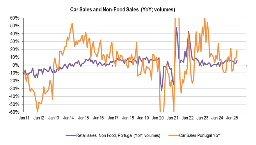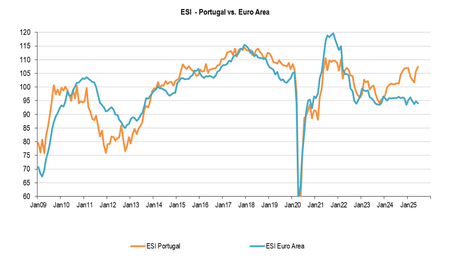 In general data has been ambiguous, the Daily Economic Index, a weekly data provided by the Bank of Portugal (BoP), but not official (“based on high-frequency data and makes it possible to capture changes in economic activity in a timely manner”) has underperformed over the quarter, average data slightly negative, on an yearly basis. Meanwhile, retail sales data (April and May) remained robust and soft data like ESI (Economic Sentiment Indicator, a composite index that reflects the overall economic confidence of businesses and consumers), is also outperforming.