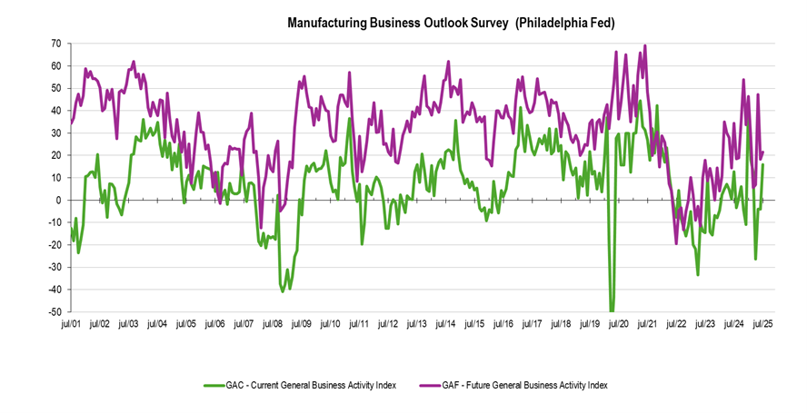 1 – The US economy remains surprisingly resilient. Two monthly Fed surveys about the US economy, that we usually follow, were released last week, “Empire Sate Manufacturing”, NY Federal Reserve Bank and “Manufacturing Business Outlook Survey”, Philadelphia Federal Reserve Bank. Both recorded expansion in July, the Phila Fed Current Conditions went up from -4 in June to +15 in July, while the NY Empire State Manufacturing Current conditions +5.5 vs. -16, in the prior month, the “Future Business Activity” remain positive in both indices. The Weekly Economic Index Dallas Fed, that provides a signal of the state of the US economy, has recently smoothly increased, to levels slightly above 2%YoY and 2Q25 average data around 2.26%, just slightly lower than 1Q25.