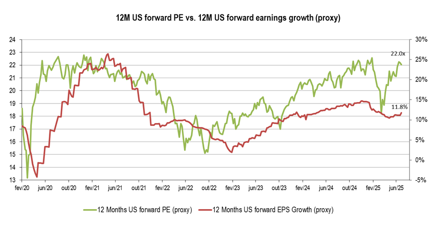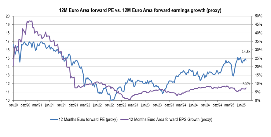 All in all, the US economy has gained momentum recently, despite the uncertainty triggered by the US Administration, remaining surprisingly resilient. Meanwhile, forward earnings continue to be reviewed upwards, partially explained by the mechanical effect, as the year goes on, forward growth, as usual, increases, ceteris paribus. Finally, valuations remain inappropriate for “Value Investors”, however assuming that over the coming weeks/months more Tariffs Agreements will be settled, the positive environment should remain in place and Multiples should continue to expand.