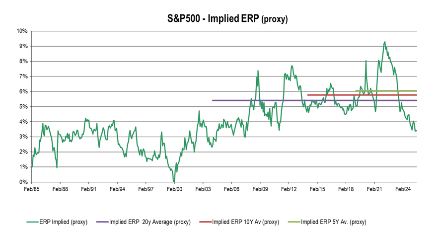* ERP – the implied equity risk premium is our preferred measure to value the equity market. Basically, is a Dividend Discount Model, based on several premises that we keep over time. The historical data allows us to have a quantitative opinion regarding the equity market. The ingredients are, earnings consensus proxy, interest rates, 10-year government bonds and finally, inflation data, namely core data. Higher figures vs. historical data indicates the stock market could be undervalued and vice-versa.