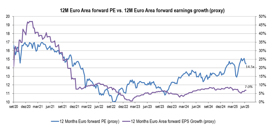 All in all, the US economy is not outperforming, however is not falling off a cliff either; so, remains resilient, as has been the case over the recent years. Valuations are above average figures, signalling investors should be cautious. Even so, the forward growth should accelerate during the second half, namely in the US. Assuming, over the coming six months, a stable forward PE and stable forecasts, the S&P500 could finish the year at 6350; meanwhile as growth accelerates, investors could demand a higher PE, for instance 6500, would mean an implied forward PE 21.6x; almost in line with the figures recorded by year end 2024. So, remains easy to be bullish on equities, assuming the current environment, i.e. no major negative surprises on earnings.